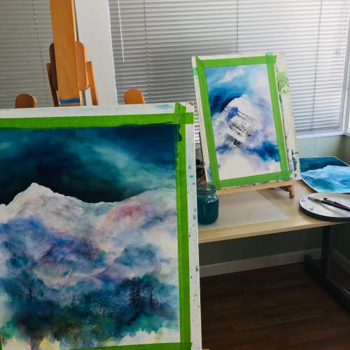Jenny Liu’s artwork reflects her fascination with the mountains of beautiful British Columbia and watercolor medium. Working intuitively, Jenny explores memories, imaginations and emotions in her atmospheric and ethereal semi-abstract style landscape paintings.